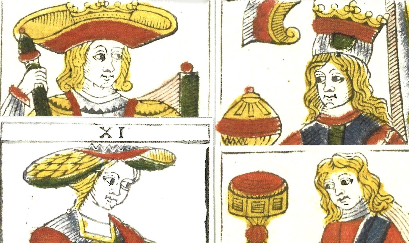 Madenié’s deck is one of the best-quality wood block TdMs to survive from the eighteenth century. The stenciling can be rather sloppy on these historic decks. But the Madenié workshop did an excellent job lining up the stencils and keeping the ink inside the lines, with a few exceptions where blobs of ink landed outside the shape. The beautifully carved faces with their pleasant expressions make this deck stand out from the crowd.