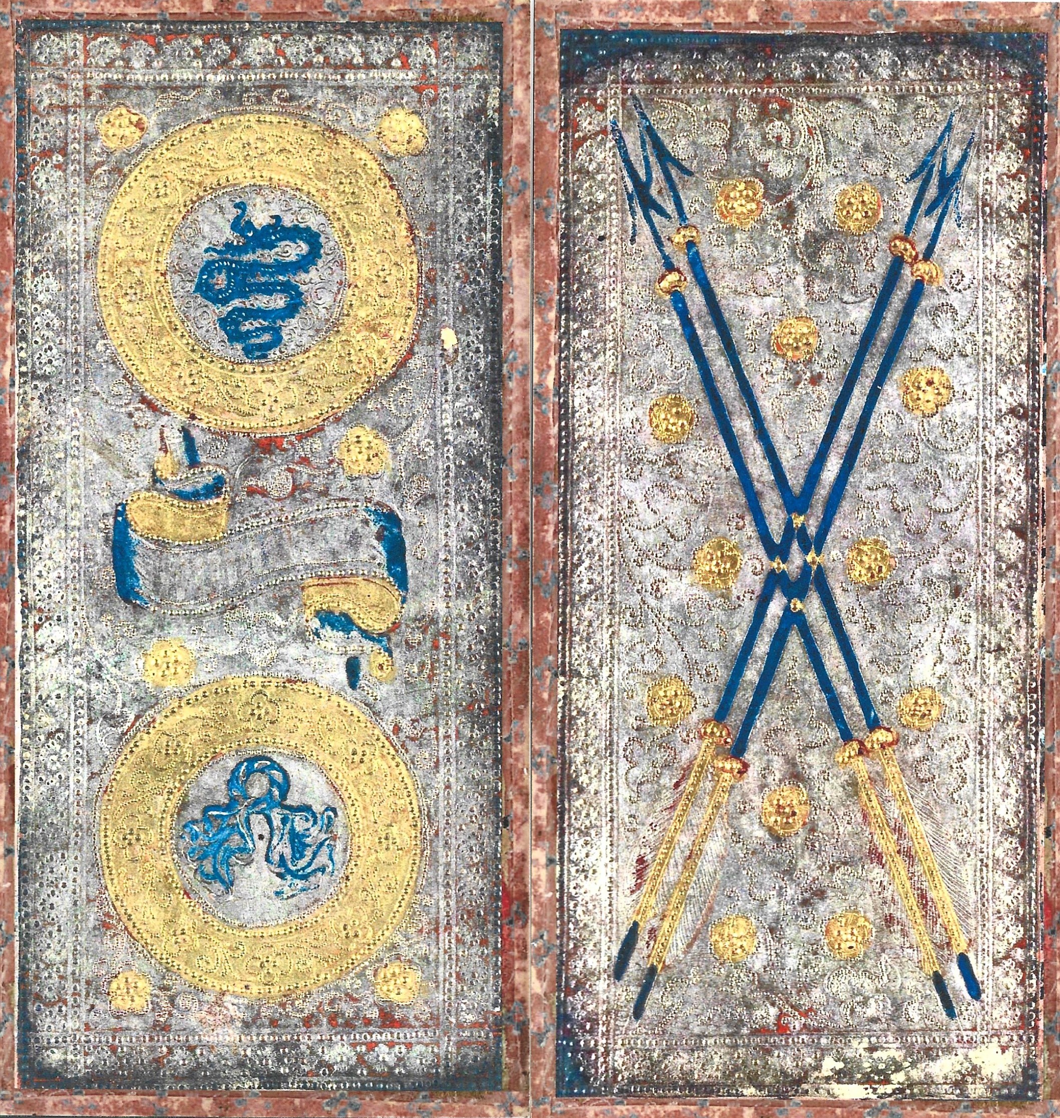 Only one pip card is missing, the Three of Coins, which was digitally restored. Suit symbols are painted in blue with gold highlights on embossed silver foil. Big mistake! The silver quickly tarnished to black. Benedetti digitally lightened the cards to resemble their original appearance. Shown here is the Two of Coins with Visconti heraldry in the center of the coins.