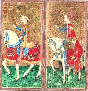 This deck has a total of twenty-four court cards instead of the usual sixteen. Each suit has six court cards arranged in three male/female pairs: King and Queen, male and female mounted Knights, and a Page paired with a Lady-in-Waiting. These latter were not servants. Both Pages and Ladies were young aristocrats serving an apprenticeship to prepare for their adult roles as a knight/courtier, or as a noble wife presiding over her husband’s court. At the left are the male and female Knights of Cups.