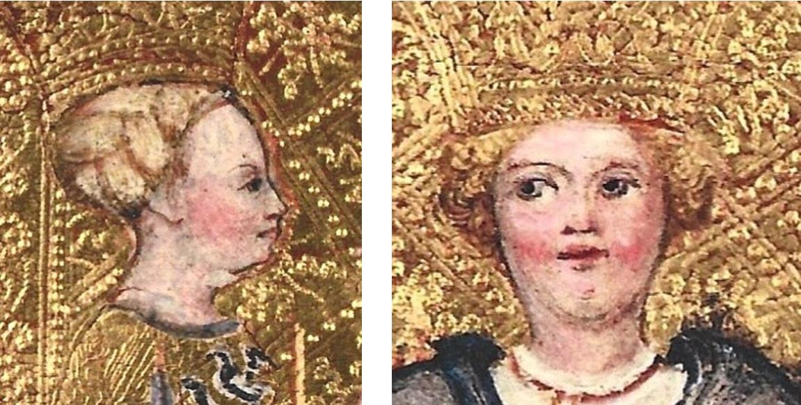 Except for a few older men, all court figures have curly blond hair and very pale skin, which was the standard of beauty at the time. This type is abundant in the International Gothic art of the early fifteenth century. The women have very high foreheads accomplished by plucking. Fashion victims bleached their hair by soaking it in a solution of herbs and urine, then sitting in the sun for hours. In other decks of the era, the court figures have vacant eyes and round, expressionless faces, making them look like rather dim-witted children. The expressive faces in this deck are a tribute to the artist’s skill.