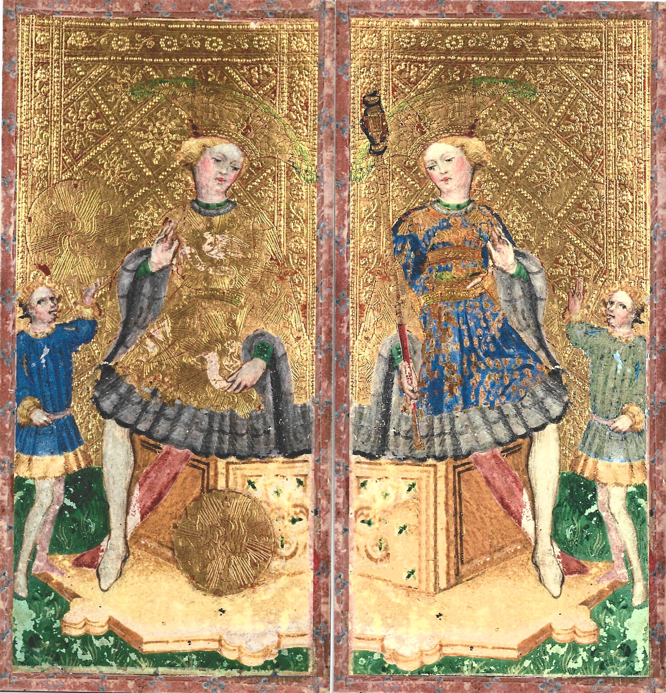 Four court cards were borrowed from other decks: two from the Visconti-Sforza and two from the Brambilla. Shown here are the Page of Coins from Brambilla and Page of Swords from Visconti-Sforza.