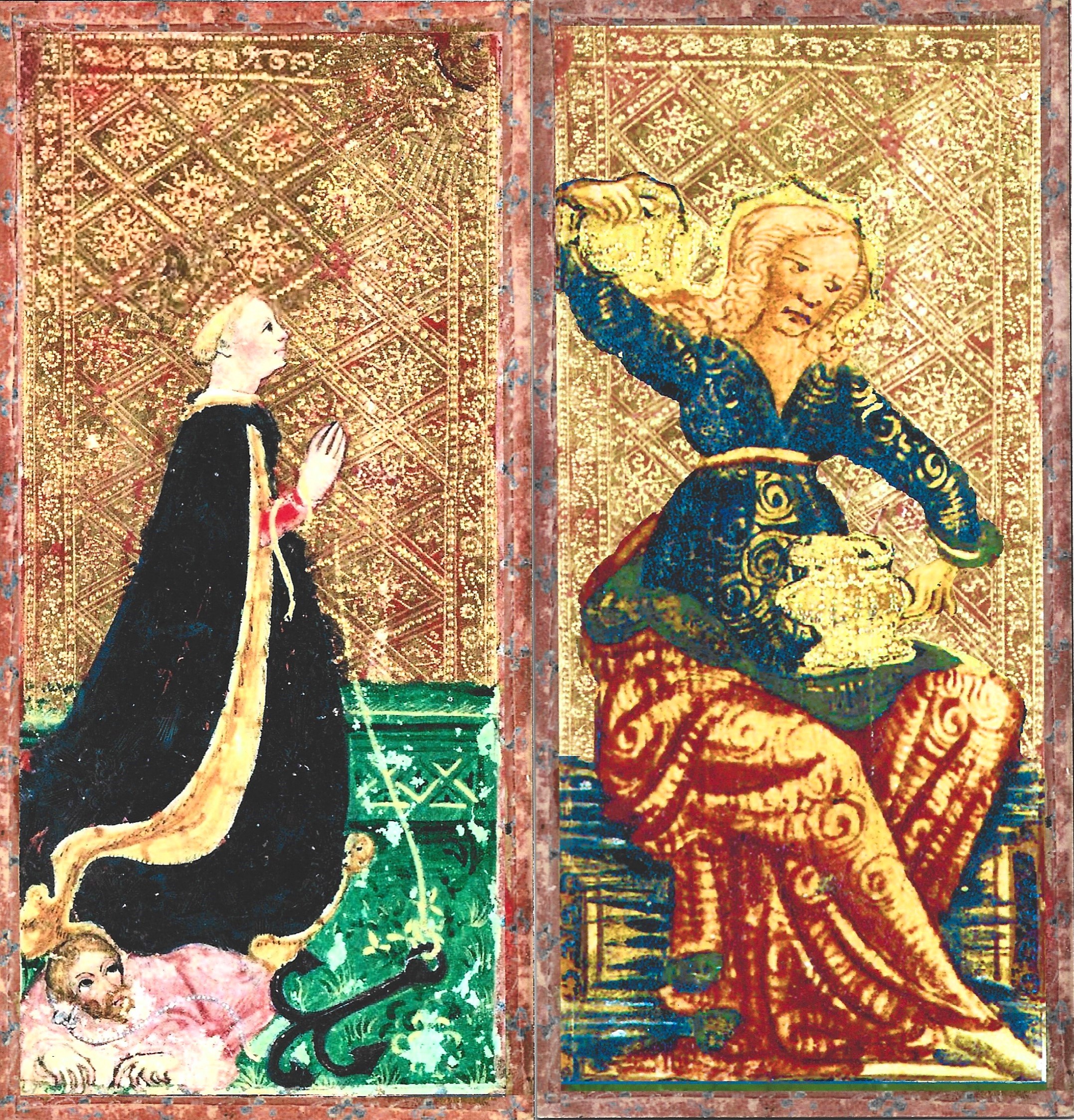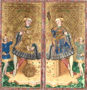 Duke Filippo had another reason to honor Emperor Sigismund. The Duke’s only living child was Bianca, his illegitimate daughter whose wedding was celebrated with this deck. The Duke paid a hefty fee to the Emperor, and in return received a document decreeing that Bianca was legitimate and the Duke’s rightful heir.