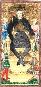 This original card may depict an actual historical event featuring the Holy Roman Emperor, Sigismund of Luxembourg. Sigismund made a two-year procession through Italy starting in 1431 and ending in Rome, where he was installed as Holy Roman Emperor by the Pope in 1433. The Holy Roman Emperor was also King of Italy, and traditionally received the Iron Crown of Lombardy from the hands of the Duke of Milan. On the lower right of the card, a kneeling figure seems about to hand a crown up to the Emperor.