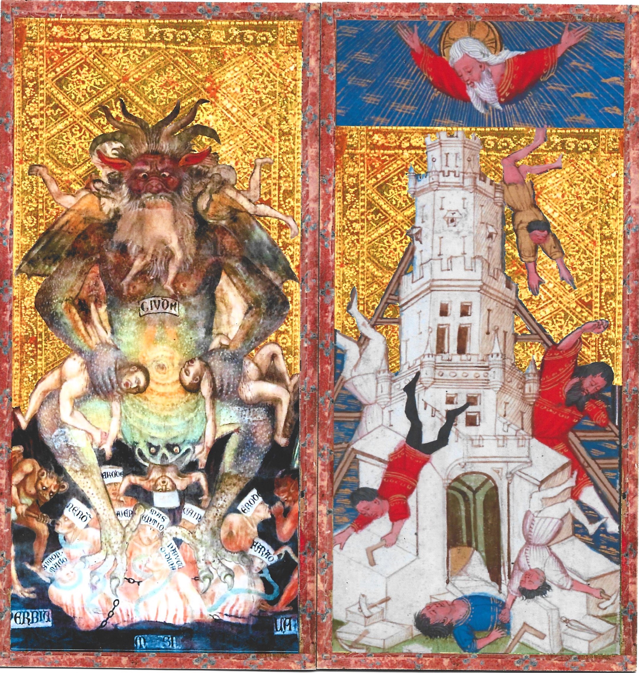 These two cards, missing from the original deck, were replaced with images from late medieval art. The Tower is an illustration of the Tower of Babel from an unidentified illuminated manuscript. The Devil is taken from a Last Judgment fresco done in the 1390s by Taddeo di Bartolo and located in the town of San Gimignano.