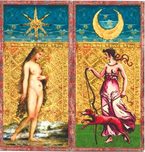 These two cards are illustrated with nineteenth-century images. The Star is taken from The Birth of Venus, a painting by Gustave Moreau done about 1866. The Moon is adapted from a tarot deck by Giovanni Vachetta, published in 1893. The Sun (not shown) depicts Apollo with his lyre borrowed from Giuseppe Mitelli’s deck published in the early 1660s.
