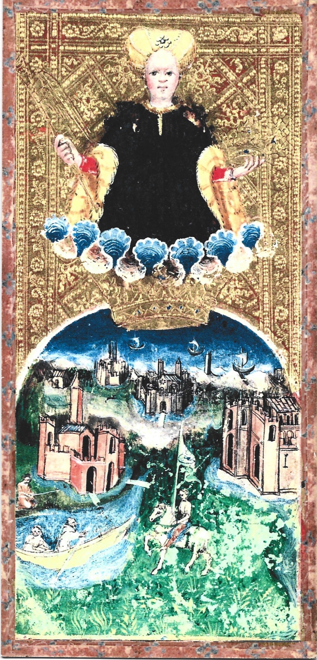 This may be a Lombardy landscape with the ocean on the horizon. Duke Filippo greatly expanded Milanese territory, so the towns could be his newly conquered possessions. The woman at the top of the card is too fashionable to be an angel. She may be an allegorical figure handing the Duke symbols of worldly rulership.