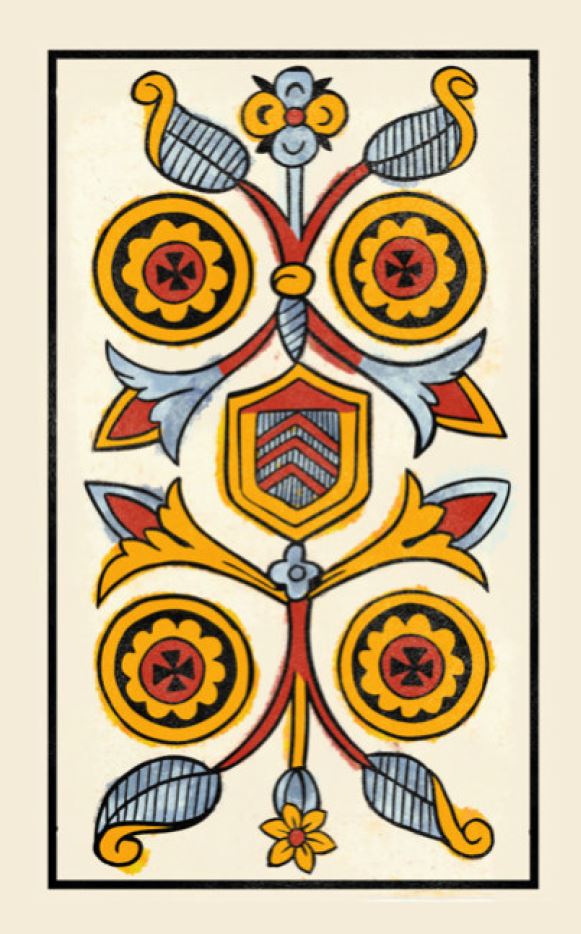 I have to admit to a personal bias. I love the pips! I know these minimalistic cards, with no scenes to suggest their meaning, are a huge stumbling block for many people. But I see each card as a field of vibrating energy. There’s no need to apply attributions from esoteric systems as a crutch. Enrique Enriquez’s “visual poetry” approach to tarot underlies this section of the book, adding to the depth and poetry.