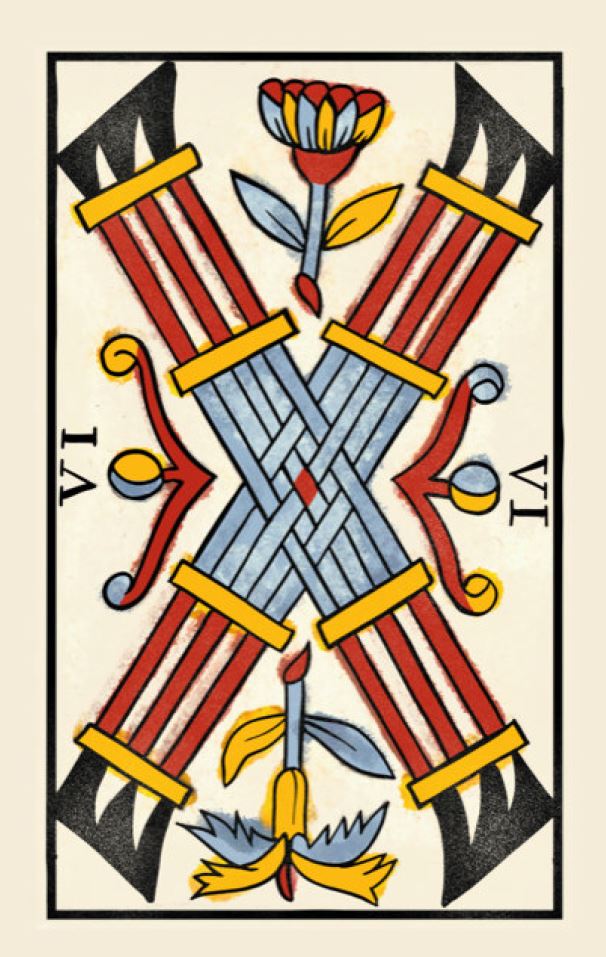 The section titled “Over Under Sideways Down” introduces us to the energy dance of the pip cards. Even-numbered Batons cards are described in terms of lines of force : “(They) have flowers and leaves that emanate from both the ends and the sides of the bundle of staves, implying an equilibrium of natural forces that signifies both breadth and depth of creative expression working in harness with the more directed outward focus of the staves themselves.” The discussion of even-numbered Cups focuses on their “vertical bisecting ‘spine’ of leaves and flowers that keeps the chalices strictly aligned and segregated, implying that there is little opportunity for creative intermingling of their contents.”