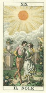 The middle card is from Lo Scarabeo’s Anima Antiqua series, printed in 2020. The Lovers and Sun cards shown above are also from this deck. Titled Tarocco Sopraffino, the size and the colors are nearly identical to Il Meneghello’s cards.