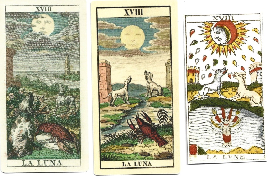 The Soprafino Moon card on the left has the same components as the Tarot de Marseille card on the right: the moon, two dogs, two towers, a body of water and a crustacean. But the scene, set near an estuary, is rendered in realistic detail. Towers and boats in the distance give depth to the scene. Inexplicably, a boiled lobster on a silver platter dominates the foreground. Nearly all Milanese card makers discarded this image and made a version of the TdM. The Dotti workshop, which I’ll discuss in detail below, created an elegant compromise. The distance is flattened somewhat, and the dogs and towers are more symmetrical, but not as stiff as the TdM. The water meanders into the distance rather than being confined to a basin. The lobster has been freed from his platter and seems rather animated. (Edoardo Dotti, 1862, reprinted by Giordano Berti).