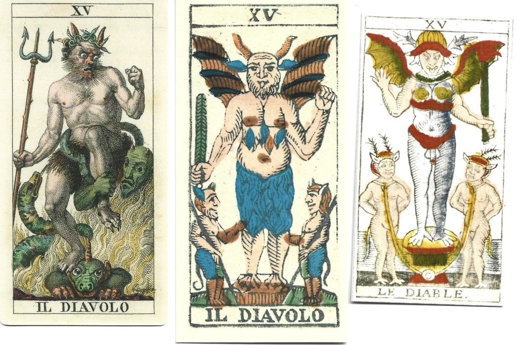 Three cards that were radically redesigned are discussed below (Moon, Bagatto, and Devil). It seems the public was not happy with this break from tradition, so subsequent card printers had to back off and make these cards more TdM-like, creating hybrid images that were typical of Milanese-style decks. In the three sets of cards below, the Soprafino card on the left is from the Anima Antiqua deck, the typical Tarot de Marseille on the right is the Pierre Madenié Tarot, from Dijon, 1709, in a facsimile recently produced by Marco Benedettti. The center card is a compromise between the two published in nineteenth-century Milan.