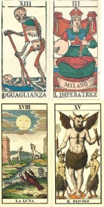 The Soprafino Devil sits among flames and writhing green monsters. He looks horrified as he shakes his fist at something beyond the card’s border. This is a complete contrast to the TdM devil standing stiffly on a podium with his two minions. As with the Moon card, most Milanese card makers tossed out the Soprafino image and went with something more familiar. Rather than the French Tarot de Marseille Devil, they adopted the Devil in furry pants from Piedmont decks, which was later picked up by the printers of Besançon (Jupiter/Juno) cards. The center card is from a woodblock deck that’s a mixture of TdM and Soprafino imagery, printed by Gumppenberg shortly after he published his luxurious Soprafino deck. As an astute businessman, he published a wide range of cards, from exquisitely beautiful and expensive novelty decks, to simple block printed decks that appealed to the average card player. (This deck is a Gumppenberg facsimile by Il Meneghello, 1995).