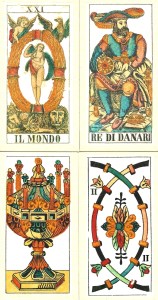Soprafino’s unique card images set the tone for the Milanese/Lombardy style that was very popular for the rest of the century. Here are some examples illustrated with the Anima Antiqua deck: