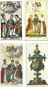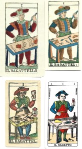 Numerous print shops, besides the ones discussed above, printed Milanese style decks that combined soprafino and Tarot de Marseille imagery in varying proportions. I’ve provided a comparison of four Bagatto cards to show the variety.