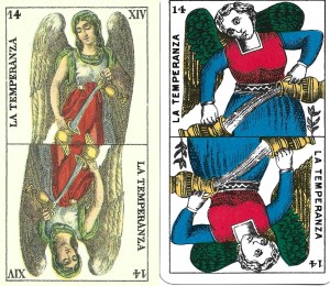 There must be many double-headed Soprafino decks out there, but I only have two in my collection. On the left is the Tarot Genovese, printed in 1887 by Fratelli Armanino. It’s a close copy of the Avondo Brothers version of Dellarocca’s engravings. Next to it is a reprint of Masenghini’s late 19th century simplified woodblock deck which combines Tarot de Marseile and Soprafino imagery.