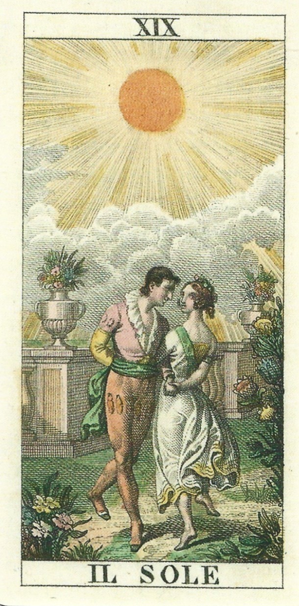 A craze for elaborate and fanciful tarot decks swept through mid-nineteenth-century Piedmont. Giordano Berti discovered and printed several of these ornate decks. Two shown here were directly inspired by the Soprafino deck.