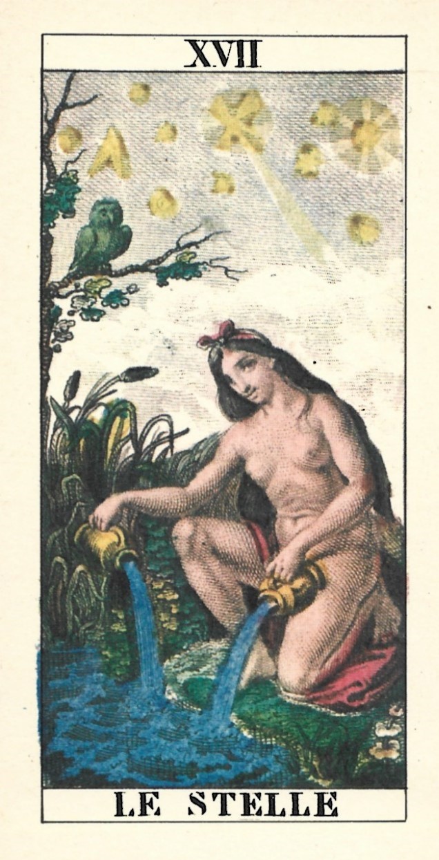 Bordoni’s tarot decks were revived by Vito Arienti when he established the Il Solleone publishing company near Milan in 1969. During the 1970s and 1980s, he focused on printing facsimiles of nineteenth-century decks, including many by Bordoni. On the left is the Star card from Gumppenberg’s original Soprafino deck reprinted by Il Solleone in 1981 using dark, intense colors. The company has closed, but their Milanese decks can still be found online. Osvaldo Menegazzi worked with Arienti until he left to establish his Il Meneghello line of cards that includes a variety of Milanese facsimiles printed in the 1980s and 1990s.