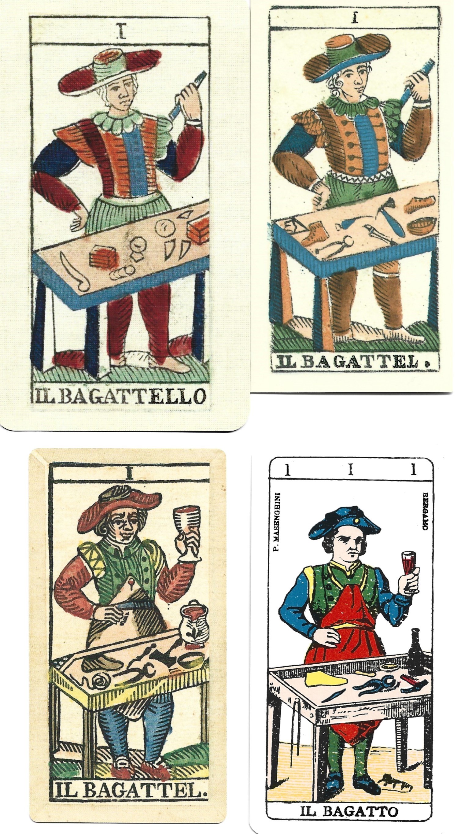 On the upper right we see a facsimile by Il Meneghello of a typical Milanese card printed by Gumppenberg about 1840. This wood block deck was intended for the average card player. The Bagatto is a blend of the two styles: a stage Magician holding a wand, but with cobbler’s tools on his table.