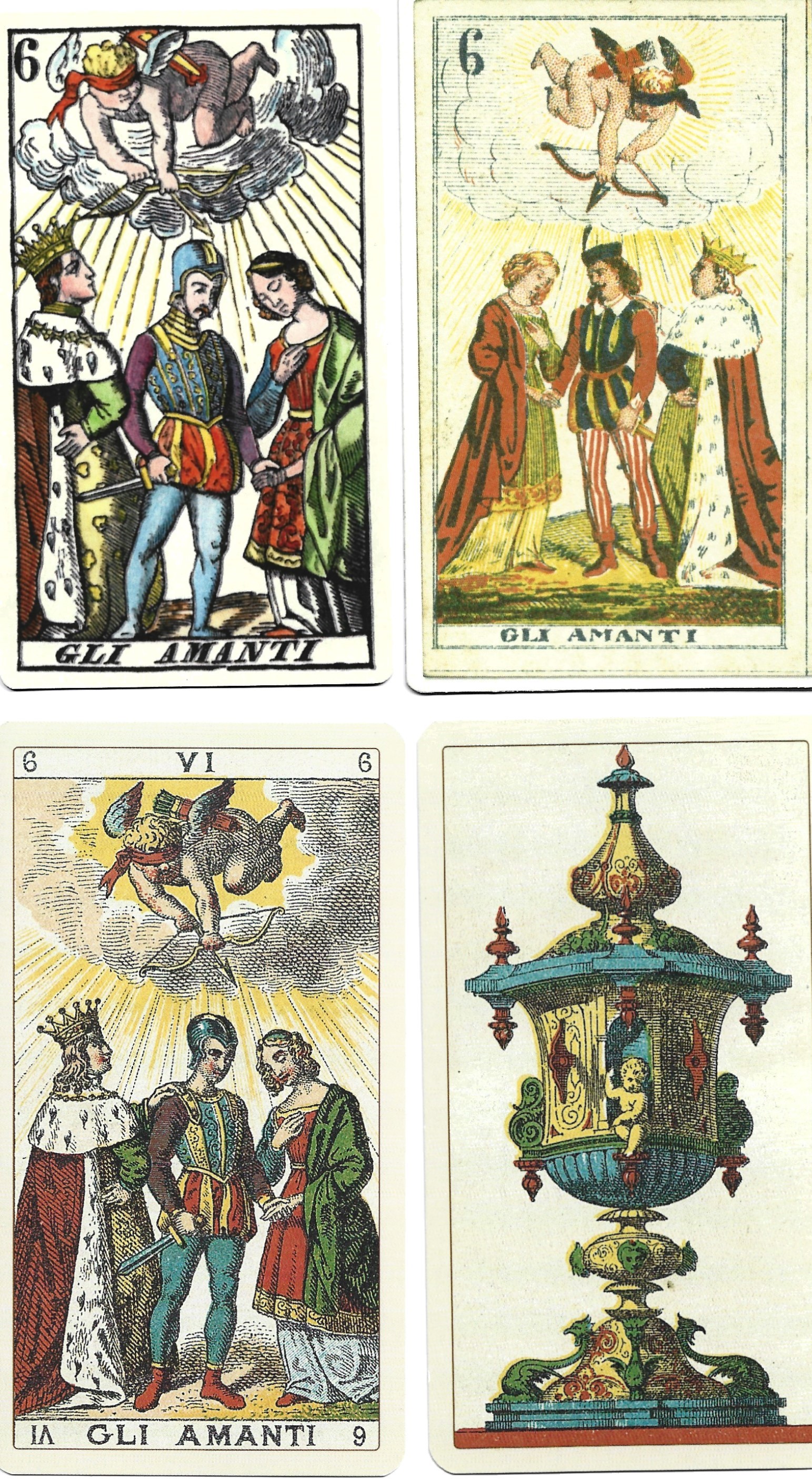 The Avondo Brothers’ large printing plant dominated the town of Serravalle throughout the eighteenth and nineteenth centuries. The bottom two cards are from their 1880 deck that’s marketed by Lo Scarabeo as the Ancient Italian Tarot. The trumps are a faithful copy of the Soprafino deck rendered in wood carving, which gives the cards a more robust energy. The abundant vegetation and ornamentation on the pips gives each card a distinct personality. This deck is my favorite for reading because each card has a unique voice. The Ace of cups is unique to this deck. A cherub sits in a doorway cut into an elaborate chalice while four dolphins lend stability to the base. The Masenghini deck described above is one of the few that copied the Avondo Ace.