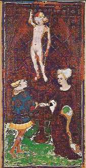 U.S. Games and many Italian publishers do photo reproductions of the Visconti-Sforza deck. Gold leaf has fallen off in spots showing the red backing, paint has chipped off the edges, and all cards have a hole at the top where they were strung on a cord or tacked to a wall. The Lovers card is in the worst shape.