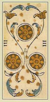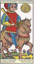Old TdMs often have mildew spots, broken lines due to worn wood blocks, and stenciling that doesn’t always match the lines. This Tarot de Marseille, originally published by Zoni of Bologna in 1780, is an example of a typical tarot deck for game playing. It was published by Lo Scarabeo in 2000.