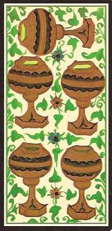 These cards are printed from photographs of a deck in a museum, so you see the deck as it exists now, with creases, chipped paint and mildew. Faded lines, off-kilter stenciling and soft colors give these decks a charming folk art feel. It’s what you’d see if you discovered an ancient used deck in your grandmother’s attic.