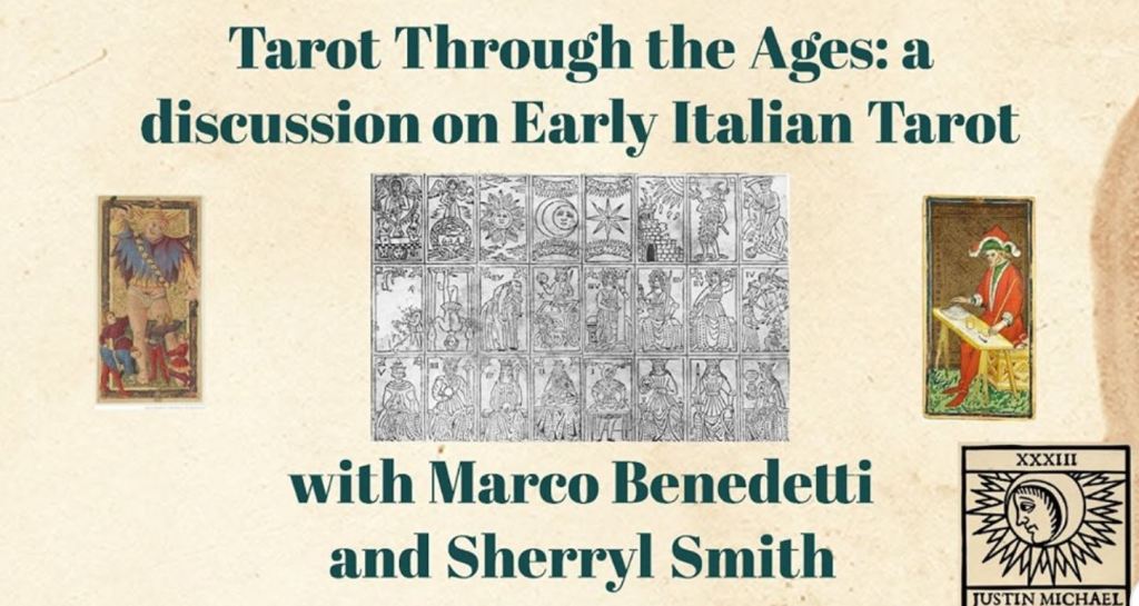 Marco Benedetti and myself in a conversation moderated by Justin Michael. We talk about tarot’s Italian origins and show off lots of decks from our collections. Here’s a chance to see historic deck facsimiles, as well as Marco’s recreations of rare Italian decks.