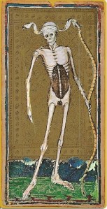 The earliest tarot Death cards, like the Visconti di Modrone card shown at the left, can be a bit gruesome—flesh stretched over bones, bits of shroud sticking to flesh, guts exposed. Why? Who wants to see that during a pleasant game of Trionfi with friends on a Saturday afternoon? Actually, this was the hottest trend in 15th century art: a taste for the macabre, a word that refers specifically to rotting corpses and skeletons with flesh attached. Let’s look at how this trend came about, and the art that inspired the tarot cards.