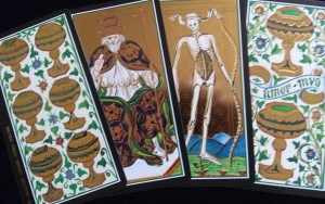 By the 18th century, when cartomancy books became popular, the concept of death as transformation, rather than an absolute end, was firmly in place. The fortune-teller Etteilla’s cartomancy books had an enormous influence on how the cards are interpreted. His exceptionally negative interpretation of the Death card may have come from a lost oral tradition. He said this card was about the failure of projects and the loss of hope, as well as corruption, putrefaction and destruction. Evidently, no one paid attention to him. Authors in the Tarot de Marseille tradition are unanimous in saying death means the end of something that needs to end anyway. Being pared to the bone implies elimination of unnecessary baggage; and it carries with it the hope of a new beginning.
