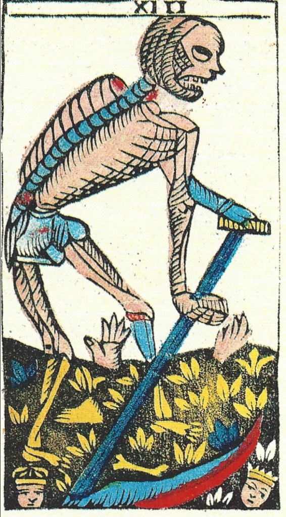 The walking Grim Reaper wielding a scythe doesn’t appear in a tarot deck until the Tarot de Marseille pattern emerged in the mid-17th century. The J-P Laurent card above right is a typical Tarot de Marseille Death card that remains the standard image today. The Grim Reaper with his bloody scythe mows down body parts as if they were grain. But the image is ambiguous. Hands seem to be sprouting from the ground like plants. This may be a new generation springing up after the old is cleared away—a promise of renewal and regrowth after the harvest.