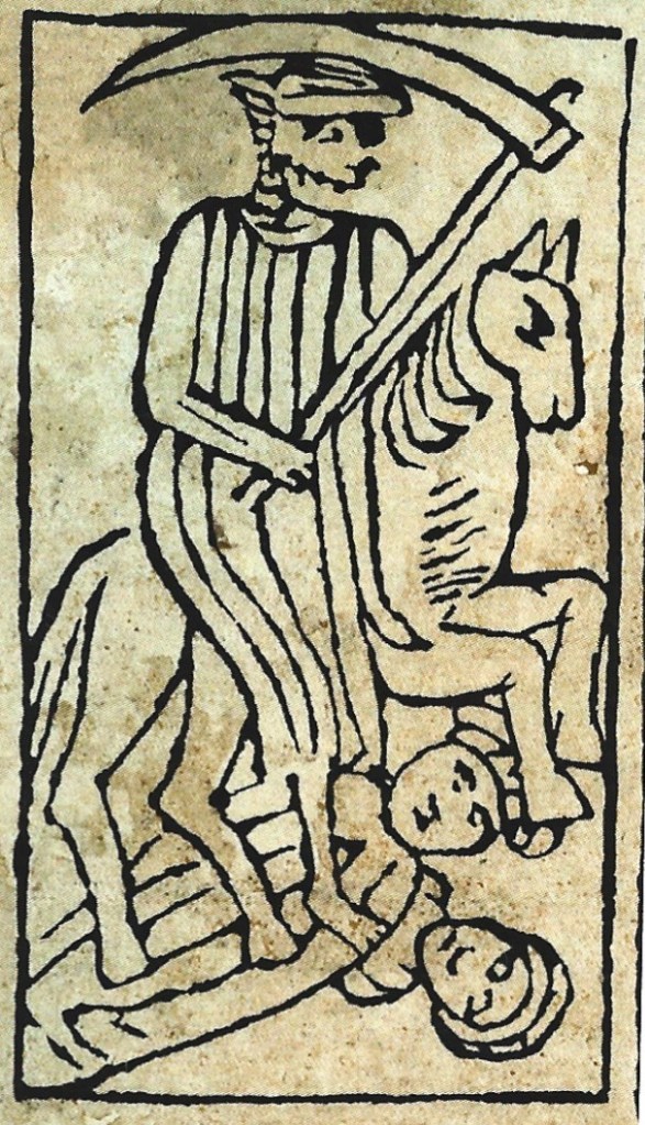 The skeleton in 15th-century Italian decks is actively killing people. Like the plague, he was an agent of death. It’s difficult for us to appreciate how the original owners of these decks saw this card. This was a time when over half of all children died before they reached adulthood; when mothers rarely reached age thirty due to childbirth complications; and when lives were constantly being disrupted because parents, lovers and business partners would suddenly die from inexplicable causes.