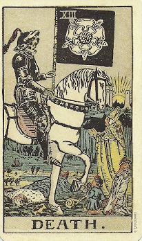 The Waite Smith Death card returns to late medieval imagery by showing Death on a horse trampling various ranks of people. A king lies dead on the ground, his crown under the horse’s hoof. A bishop begs Death for another chance at life. The woman is either fainting or turning away in denial, while the innocent child seems curious about what’s happening. Waite tells us the Hanged Man is mystical death while this card describes physical death.