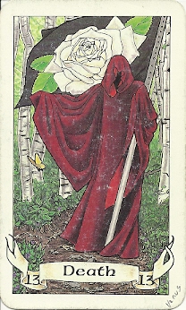 The Grim Reaper of the Robin Wood deck wears a blood red robe representing life. Instead of a scythe, he carries a black flag with the white rose of freedom. The birch trees and violets tell us it’s spring, the time for renewal and new life. Death blocks the way forward. An era is ending and it’s impossible to continue on the same path. Death points to a new path and a yellow butterfly will show the way. We don’t need a major crisis to point us to a new path; it only requires listening to the quiet intuitive voice within.