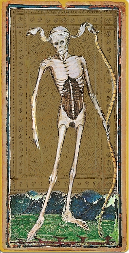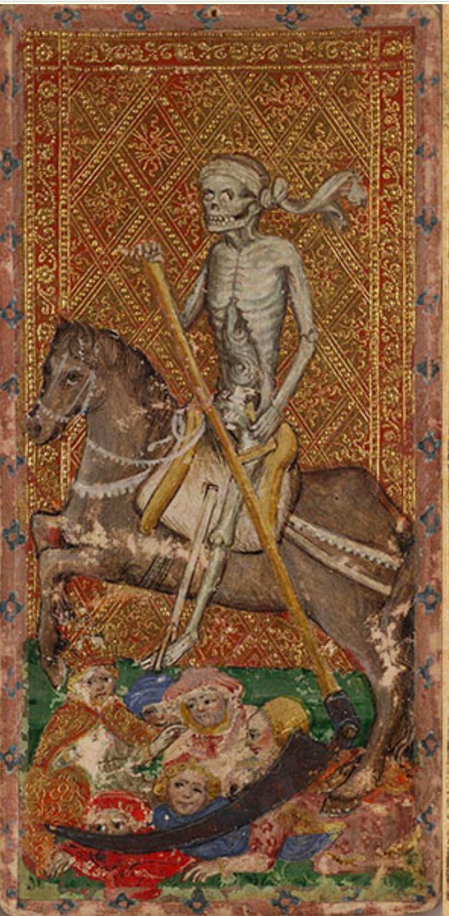 The Black Plague started in 1347 and took an estimated thirty to sixty percent of the European population. Rotting corpses would have been a common sight when the living couldn’t keep up with burials, and entire families were walled up in their houses and left to die to avoid infecting their neighbors. The obsession with rotting bodies was a way of dealing with the trauma. This artistic trend culminated in the early- to mid-fifteenth century, the same time tarot was invented; and a time when medieval culture was transitioning into a humanistic appreciation of the individual. Emphasis shifted from death as a release from this sinful world to death as the end of the individual personality, significant relationships, and enjoyment of the good things in life.