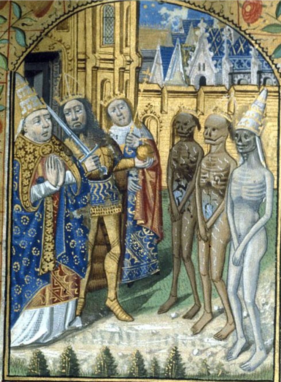 The Three Living and the Three Dead is a literary theme that predates the plague. It first appeared in the late 13th century and became increasingly popular in visual art throughout the 14th and early 15th centuries. According to the story, three noblemen who went out hunting in the forest encounter three rather lively corpses in three stages of decomposition. The corpses utter a popular medieval meme: “What you are, we once were; what we are, you will become”. This illustration shows a twist on the story. A pope, a bishop and a king confront three corpses who mock them by wearing the same headgear.