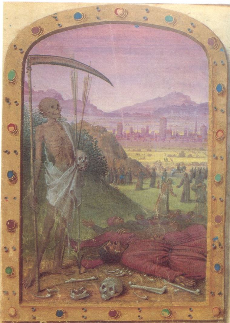 Death as the Grim Reaper, mowing down people as if harvesting wheat, appeared in art after the plague. In the illustration above left, the Grim Reaper has a scythe and arrows, indicating that the plague is responsible for the death of the victims on the ground.