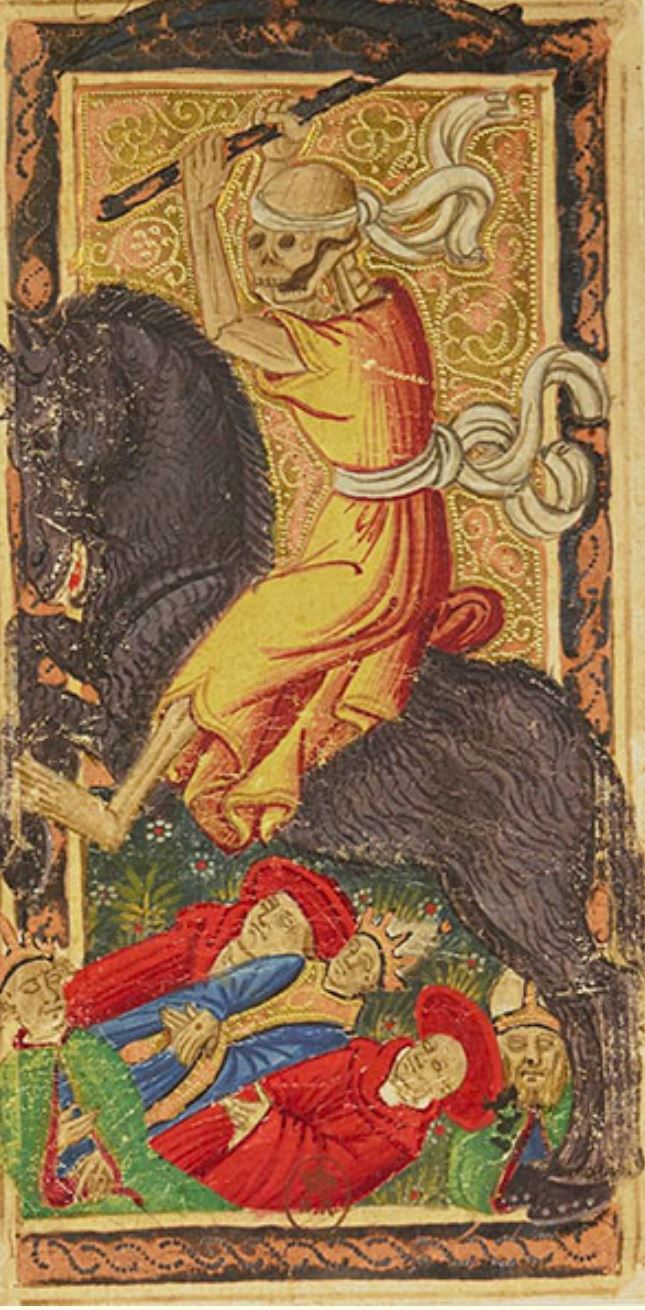 The skeleton in 15th-century Italian decks is actively killing people. Like the plague, he was an agent of death. It’s difficult for us to appreciate how the original owners of these decks saw this card. This was a time when over half of all children died before they reached adulthood; when mothers rarely reached age thirty due to childbirth complications; and when lives were constantly being disrupted because parents, lovers and business partners would suddenly die from inexplicable causes.