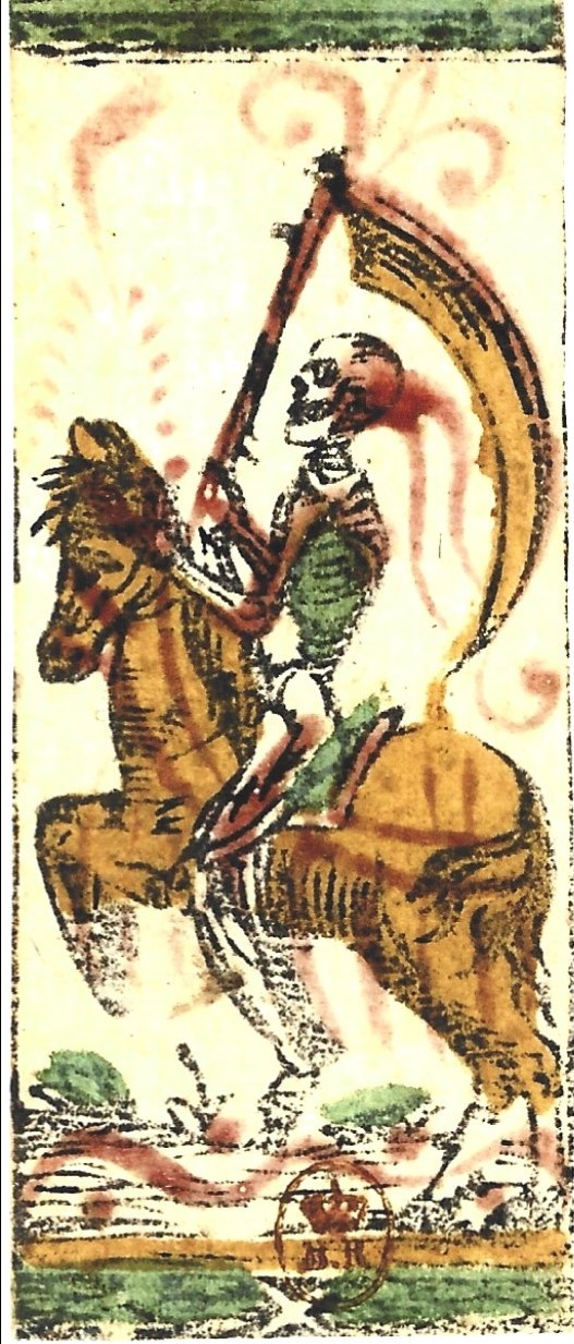 By the end of the 15th century, the Renaissance was well underway and attitudes toward portraying death were changing. Flesh over bones and exposed innards were replaced by generic skeletons. The Church began actively repressing superstitious folklore, while emphasizing the official teaching that at death the soul separates from the body with no possibility of return. If you see a ghost, a living skeleton or a dead relative, it has to be a demon. At the same time, death was becoming medicalized as the moment the heartbeat and breathing stopped. There was no longer a place for a transitional after-life state, nor for lively skeletons dancing in graveyards. But the Grim Reaper persisted in popular folklore, and he maintained his position in the tarot deck, as in this Death card from an 1801 deck by J. Joerger.