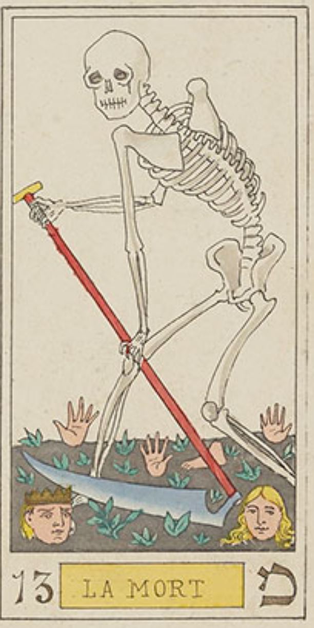 By the 18th century, when cartomancy books became popular, the concept of death as transformation, rather than an absolute end, was firmly in place. The fortune-teller Etteilla’s cartomancy books had an enormous influence on how the cards are interpreted. His exceptionally negative interpretation of the Death card may have come from a lost oral tradition. He said this card was about the failure of projects and the loss of hope, as well as corruption, putrefaction and destruction. Evidently, no one paid attention to him. Authors in the Tarot de Marseille tradition are unanimous in saying death means the end of something that needs to end anyway. Being pared to the bone implies elimination of unnecessary baggage; and it carries with it the hope of a new beginning.