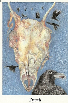 The reindeer skull of the Greenwood deck is being picked clean by ravens. The card delivers a harsh message: Life will inevitably strip us to the bone and leave us without our usual defenses and denials. This card isn’t about physical death, but the inner experience of being stripped of all illusions.