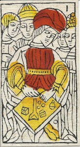 The oldest Tarot Bagatto we know of is in the hand-painted, gilded Visconti-Sforza deck commissioned by the Duke of Milan about 1453. We don’t know if this Bagatto resembles the cheaply printed playing card of that time, since none have survived. He seems better dressed than most conjurers, and his extravagant hat indicates he might be an exotic character. The items on his table could be balls and a cup, while his right hand hovers over a round object and the left hand holds a wand. The round object under his right hand has been interpreted as a pile of coins, a covered dish, a traveler’s straw hat, and a wheel of cheese, creating doubt about the figure’s identity.