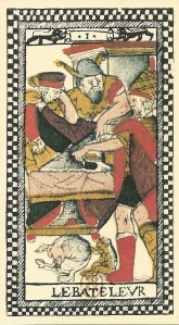 His Italian name, Il Bagatto (a word derived from bagatelle, a little thing) refers to the card’s role in the game of Tarocchi. It’s the lowest-ranking card in the trump series, vulnerable to being captured by any other trump card. Eventually, the word came to mean sleight-of-hand tricks, deception, fraud and swindling. His French name, Le Bateleur, has the same meaning.