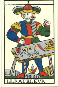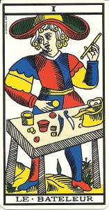 Later in the seventeenth century, Vievil portrayed the Bateleur alone, without spectators, as on the early Italian Bagatto cards. Around 1650 to 1660, Le Bateleur’s posture consolidated into what is known as the Tarot de Marseille (TdM) pattern. This standard Bateleur still looks much the same as he did in the seventeenth century. One of the earliest TdM decks in existence, the Noblet, clearly shows the implements a bateleur needs for his act: three cups, three dice, and knives for slicing up a handkerchief which he magically reassembles. He uses his wand (resembling a phallus in this deck) to distract his audience while he palms a coin or a marble with his other hand. Glancing sideways lures onlookers’ attention away from his hands. Le Bateleur wears a traveler’s wide-brimmed hat and sets up his table outdoors on the edge of a fairground or market square.