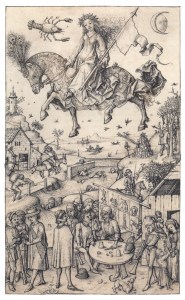 Astrology permeated all aspects of Medieval and Renaissance society. Popular “Children of the Planets” illustrations showed people performing activities associated with the planet presiding at the top of the page. The travelling conjurer always appeared as a Child of the Moon because he wanders about like the moon in the sky; and he deals in illusion, just as moonlight deceives. This print from a German Hausbuch (household almanack) shows all the attributes of the itinerant conjurer. He stands behind his table with cups and balls. A trumpeter announces his arrival, while painted acrobats draw attention by cavorting on a large curtain behind him. After his magic act, he sets his feathered hat aside to become an itinerant healer, pulling a tooth while a man with a bandaged jaw waits his turn. The conjurer’s delusional customers are lunar types as well, believing they can beat the game and earn some quick money.