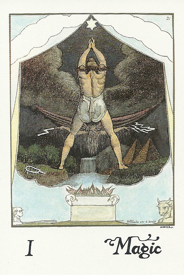 Blake’s Magician is the dog-headed god Anubis channeling celestial energies from the Dog Star Sirius, while straddling the Nile. His characteristics are will, creativity, the ability to channel energy, and his magical powers.