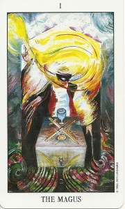 Arthur E. Waite and Pamela Colman Smith, both members of the Golden Dawn, created the most familiar Magician outside the European Tarot tradition. In his book, The Pictorial Key to Tarot, Waite says the Magician’s arms imitate the gestures of an initiate into the higher grades of a magical lodge. The Magician pulls light from the heavens and grounds it in the material world. Levi’s lemniscate, an infinity sign mirrored in the Magician’s ourobos belt, becomes “….the mysterious sign of the Holy Spirit” in Waite’s interpretation. The abundant lilies and roses represent spiritual aspiration. Waite’s divinatory meanings for the card refer back to the conjurer: skill, diplomacy, subtlety, self-confidence and will.