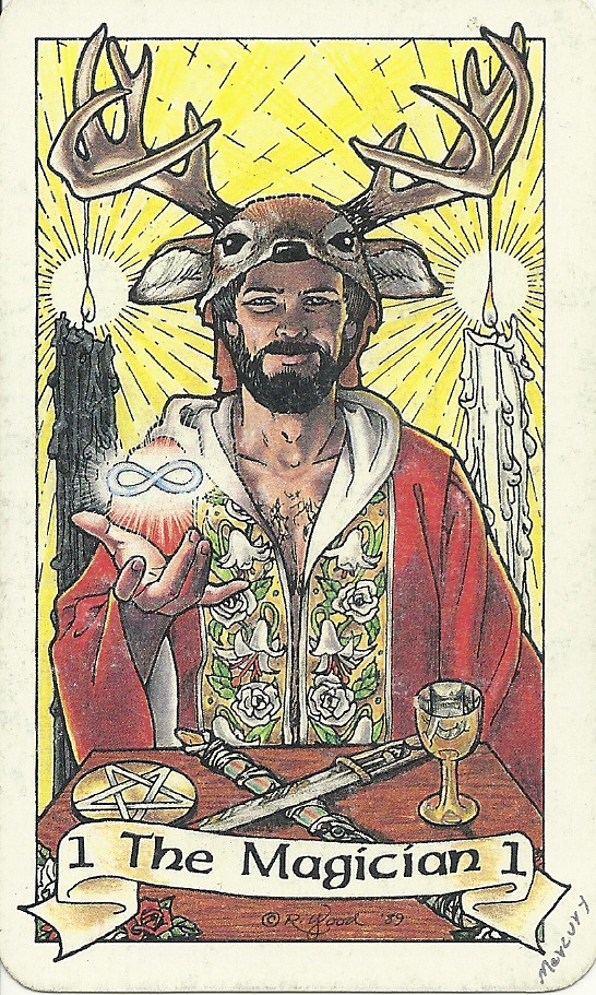 Robin Wood’s Magician is a Wiccan priest of the Horned God demonstrating his magical abilities with quiet confidence. A lemniscate floats above his raised hand while the other arm is lowered to the earth. He has mastered the four elements and all other powers embodied in the suit symbols.