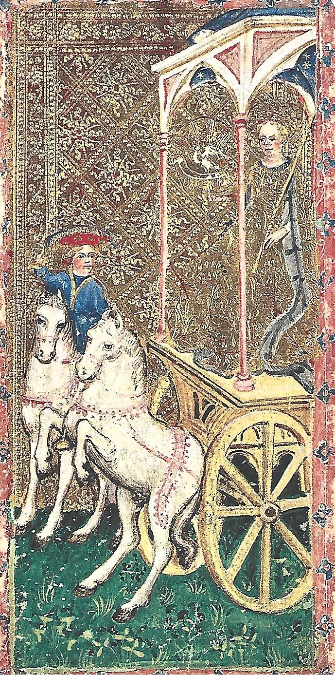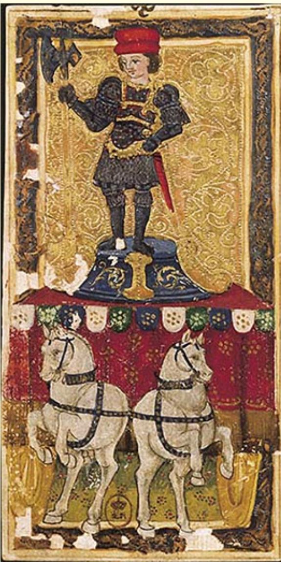Two chariot cards created in the Florence-Ferrara milieu share certain features with the Tarot de Marseille. In the so-called Alessandro Sforza card, we see the chariot head-on as in the TdM, but contrary to the TdM, the horses’ bodies are turned toward each other while their heads are turned away. The chariot is partly enclosed and its walls may support a canopy. The charioteer holds the globe and sword of rulership and wears a red hat, the most common head covering for men in the middle of the century.