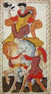 Like Petrarch’s parade, a series of allegorical figures comprise the basic structure of the tarot trumps. Mortals like the Bagatto, Emperor, Pope and Lovers are subject to Time (the Hermit), Death, and the prospect of eternal damnation (Devil). Then the Star card begins the ascent to the Last Judgment and Paradise (The World). Just as in Petrarch’s parade, each card in the game of trionfi triumphs over and capture the cards that precede it in the line-up. The Chariot card, as a symbol of triumph, encapsulates the essence of the game.