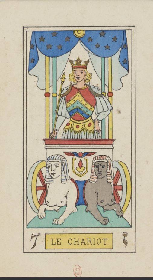 The magician and occultist Eliphas Levi had a tremendous influence on how subsequent chariot cards were imagined. In his 1855 book Transcendental Magic, he describes the trump cards and provides images for the Devil and Chariot. His description of the Chariot card: “A cubic chariot with four pillars and an azure and starry drapery. In the chariot…a victor crowned with a circle adorned with three radiant golden pentagrams.” He goes on to describe several details that deviate from the traditional TdM card. The epaulettes are called Urim and Thummim (objects worn on the breast plate of the high priests in the Old Testament, and/or two objects used by the priests for divination). His scepter is topped with a globe, square and triangle. The chariot is pulled by black and white sphinxes joined at the haunches who move in opposite ways but look in the same direction. On the front of the chariot, instead of the printer’s initials, there is a lingam/yoni (yin/yang symbol) and a winged globe, an Egyptian symbol for the alchemical sublimation of matter.